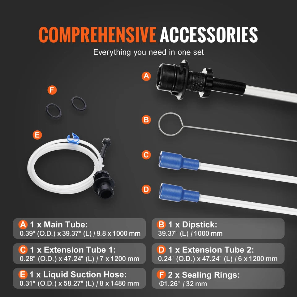 Effective Fluid Removal: Our oil extractor comes with four tube sizes to reach every corner and ensure thorough extraction. Main Tube: 249 x 1000 mm (9.8" x 39.37"); Extension Tube 1: 7 x 1200 mm (0.28" x 47.24"); Extension Tube 2: 6 x 1200 mm (0.24" x 47.24"); Suction Hose: 8 x 1480 mm (0.31" x 58.27").